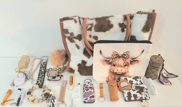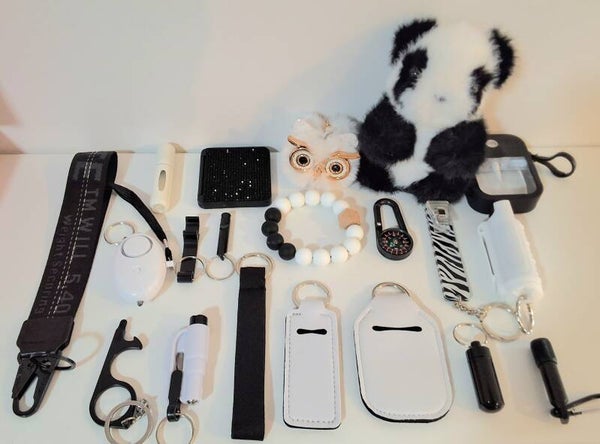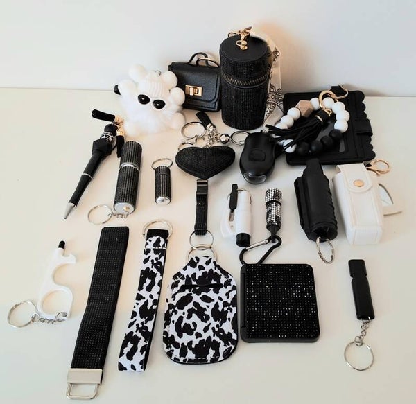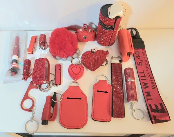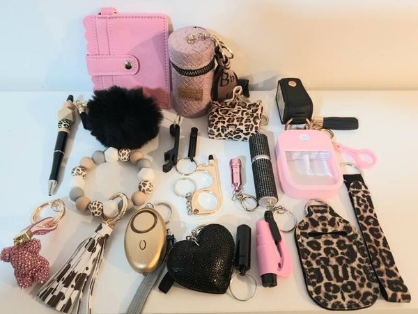 Set includes beaded keychain, personal alarm, seat belt cutter, medicine container, perfume bottle, stylus tool, whistle, wallet, pom pom, sanitiser bottle, lipstick holder, lanyard, mini torch, bottle opener, mini bag, lip gloss bag, heart keychain, mini compass, card grabber, Pepper spray(WA only) all other states, wrist strap( items subject to change depending on availability)