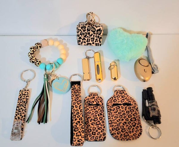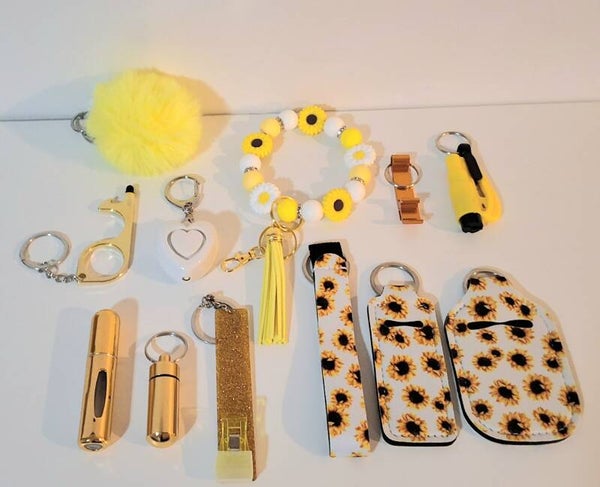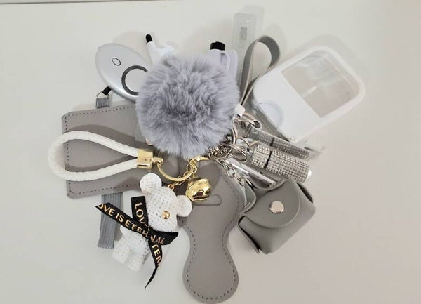 Includes safety whistle, seat belt cutter, bottle opener, personal alarm, lipstick bucket, wristlet, card grabber, perfume bottle, pom pom keychain, waterproof pill bottle, beaded keychain, mini coin purse( items subject to change depending on availability)