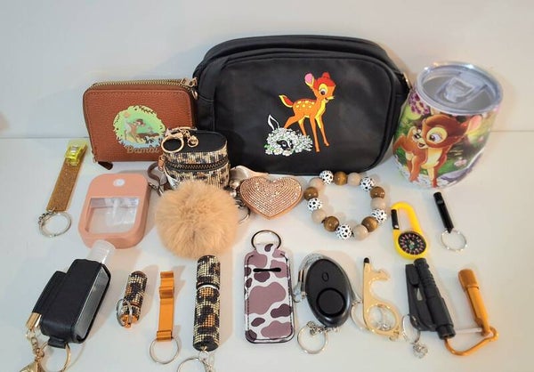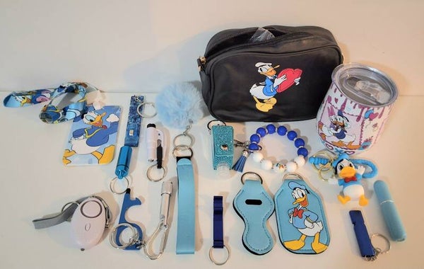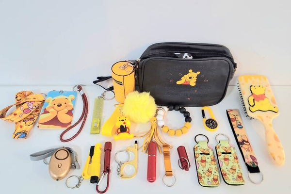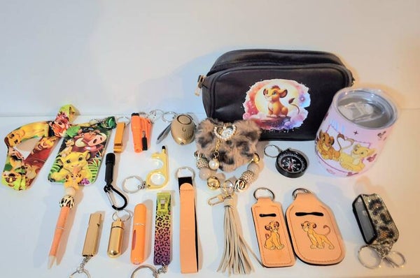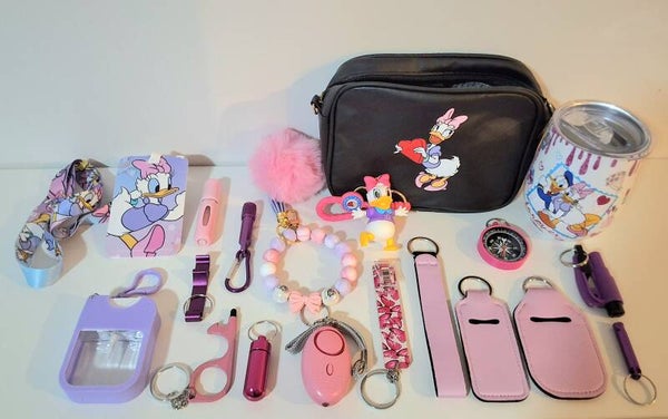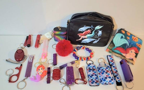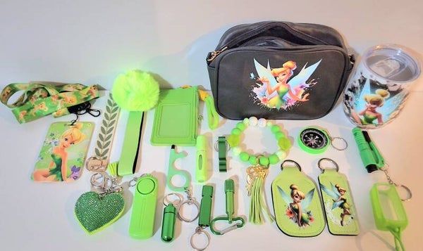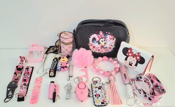 Sets include personal alarm, no key door opener, bottle opener, medicine bottle, perfume bottle, seatbelt cutter, keychain, mini bag, pom pom, chapstick holder, wristlet, compass, mini torch, self defence whistle, lipstick bucket, beaded keychain sanitizer bottle/ spray, card grabber, wallet, heart keychain( items subject to change depending on availability)